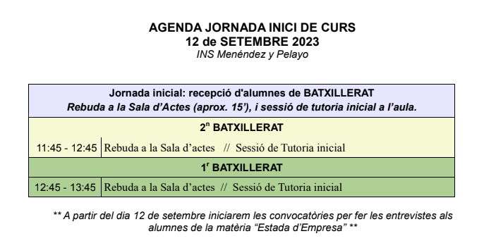 Horaris jornada inici de curs ESO i BATX